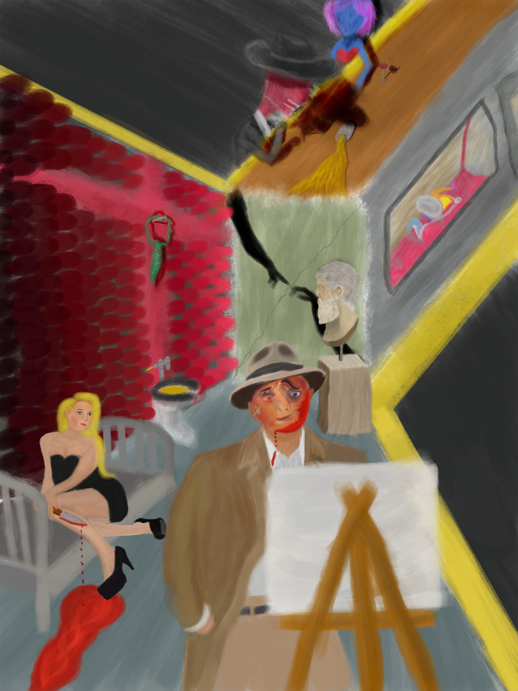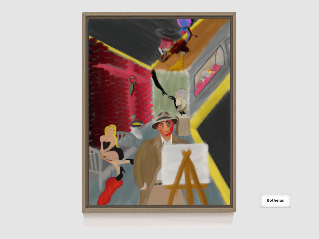 This painting Boethius is in reference to the Roman philosopher who was falsely imprisoned and executed on charges of conspiracy to overthrow King Theodoric the Great . It also features nods to Van Gogh, as well as the fictional character Andrew Laeddis from the book/movie Shutter Island.