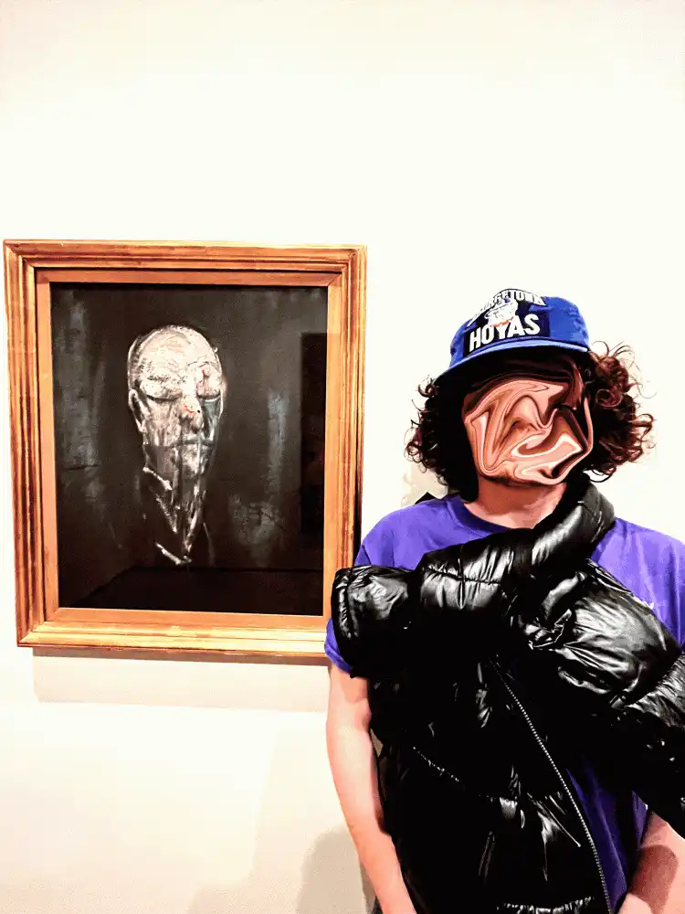 “Painting (1946)” famously captures Bacon’s aesthetic, depicting a terrifying scene where an anonymous individual oversees the butchery of meat that looks vaguely human. Though Bacon denies this, as he denies imprinting any such narratives onto his art, many people believe the half-faced individual is former UK prime minister Nevile Chamberlain, who took office directly after Churchill amid WW2. Chamberlain is infamous for his “Appeasement policy”, which gave Nazi Germany certain parts of Eastern Europe in return for the UK’s freedom. Whether or not the figure is Chamberlain the conversation remains. This painting confronts life post-WW2 by mirroring the trauma and existential dread festering Europe at the time. The cage-like structure surrounding the individual, the microphones off to either side of him, and the umbrella masking his face, evoke anxiety trademarked by the time.