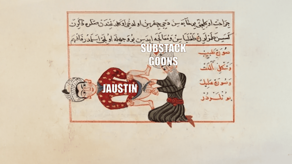 FELLOW ARTISTS, BLOGGERS, CREATORS. CALL YOUR BANNERS, RAISE YOUR ARMS, WE ARE GOING TO WAR AGAINST THE WICKED OPPRESSION THAT GOES BY SUBSTACK. THE VILE SCUM THAT MINES YOUR DATA UNDER THE ILLUSION OF FREE SPEECH WILL BE BROUGHT TO IT’S KNEES. (it sounds cooler if you read it with a JFK impression).